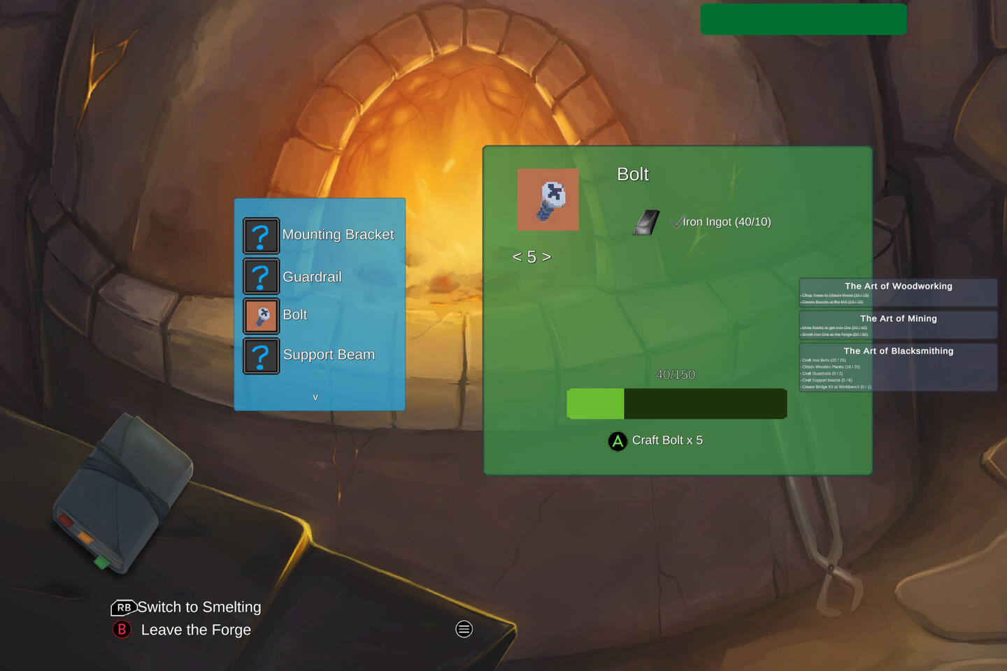 Fixed a bug with the Inventory Submenu that occured after switching to the new global configuration system.Fixed a full game crash when crafting items at the Forge.Fixed a bug where the Mounting Bracket was not tracked in the quest [The Art of Blacksmithing].Fixed a scaling issue with Quest Cards.Fixed a bug with the Inventory where the submenu would open with the inventory in some circumstances.Quests now track items being added properly.Quest Cards now properly complete when all of the objectives are completed.The Notebook UI no longer crashes the game when opening it with no known recipes.The Notebook UI now properly updates quests if you opened the Notebook initially with no quests, but then later obtained one.Fixed a bug where the Notebook UI would not properly enable or disable player movement when opened or closed after moving from scene to scene.Oxygen decay in the mines now properly starts and stops after fixing an issue with NPC interactions.Some interactions have been resolved where the Dialogue system would not properly load a dialogue.